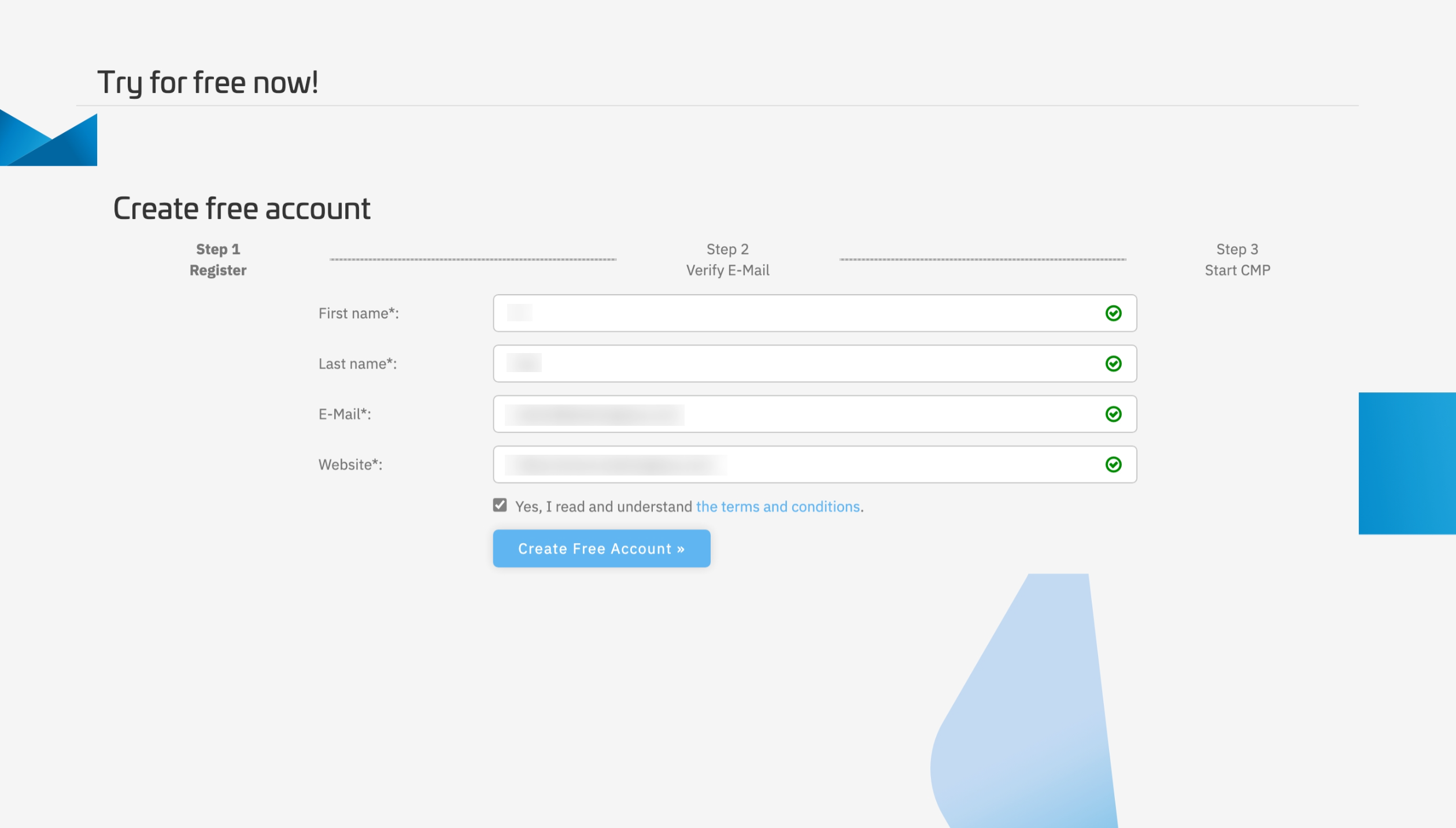 (1)在ConsentManager主页右上角,点击”Free test now“,进入注册页面,填写以下信息:
