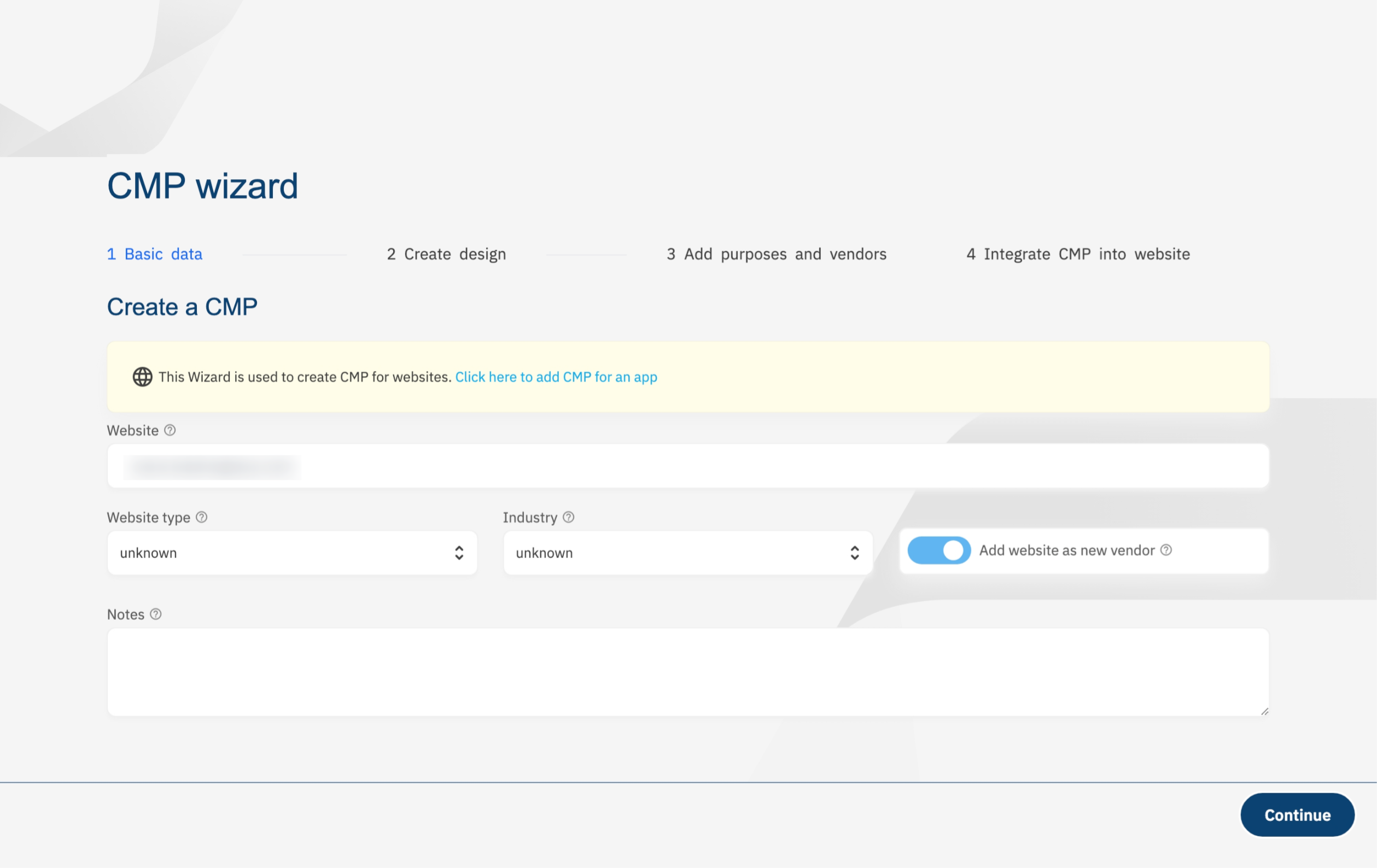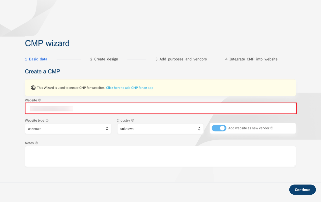 (2)在CMP配置向导页面中,第一步请在图示红框中,填写您的待配置网站URL,然后点击”Continue“按钮,以进入后续步骤;