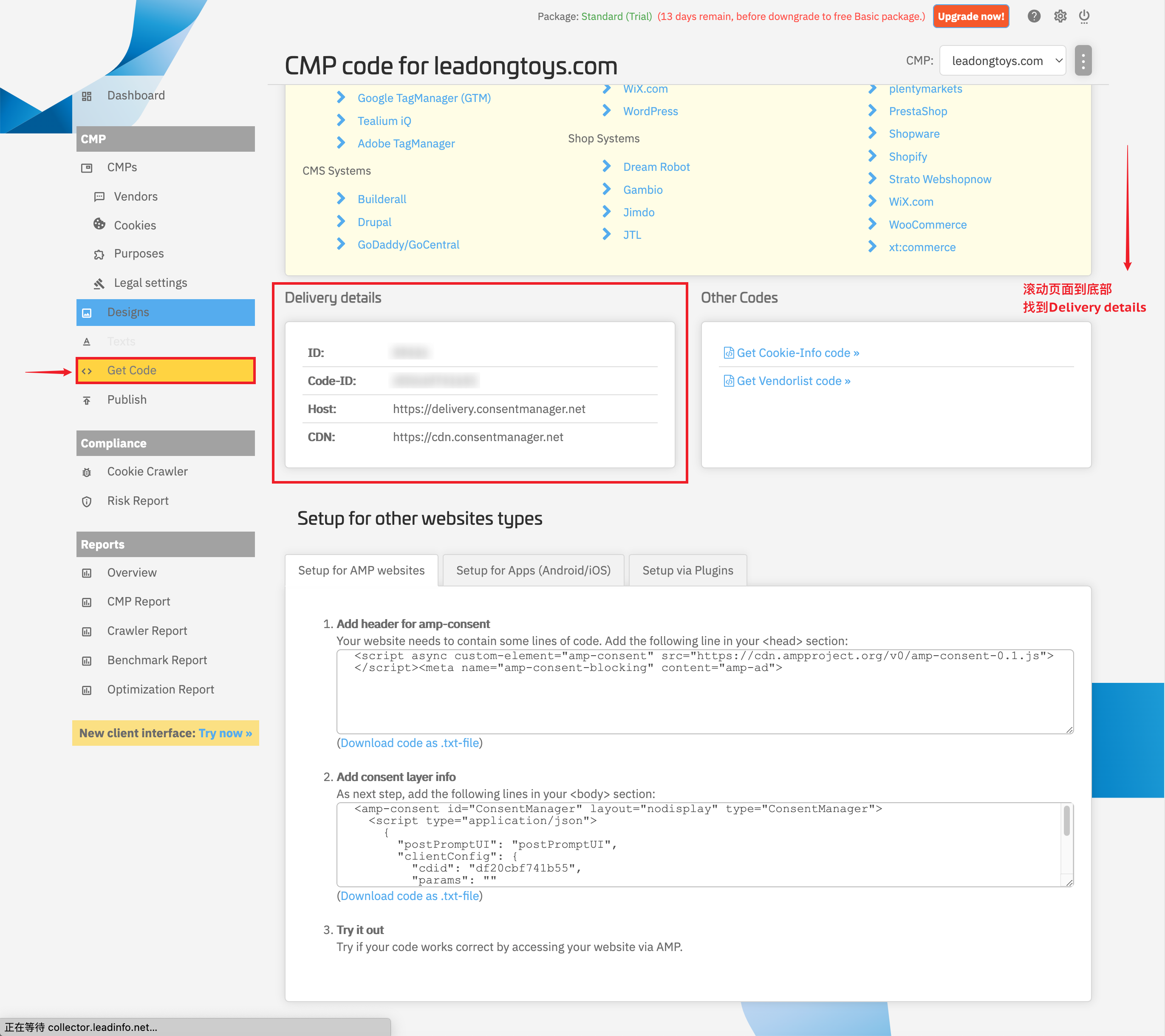 如果您在ConsentManager老版界面,请按后续图示找到“Delivery details”;