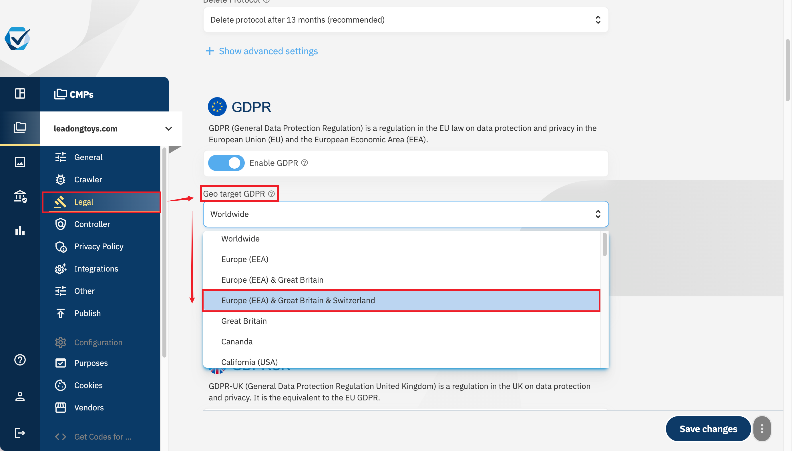 如果您不希望所有国家的网站访客都收到此 CMP Banner,则您可以在ConsentManager中按图示进行设置,最后,点击”Save Changes“即可保存生效;