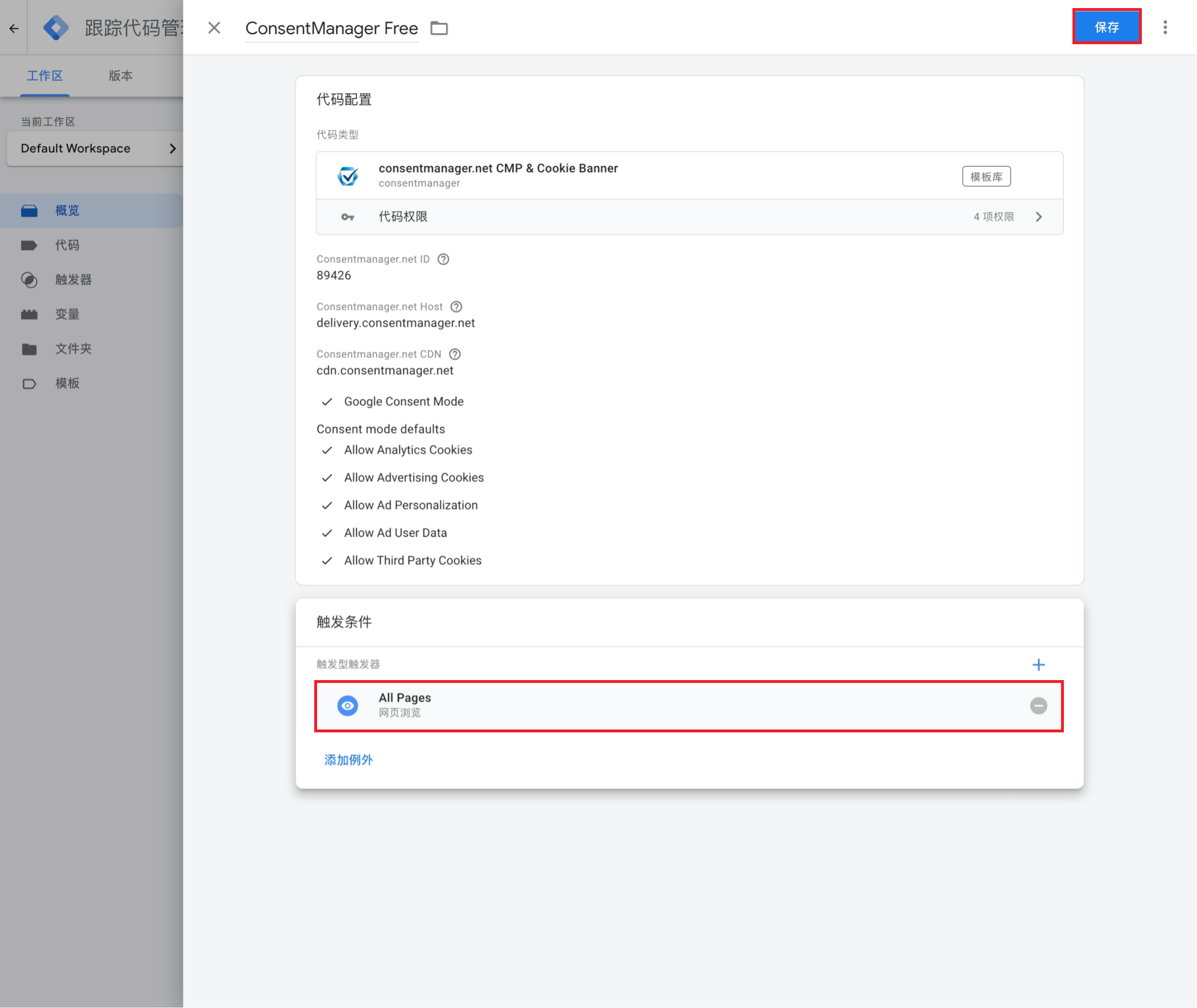 (10)设置触发条件为”所有页面“,并保存代码;