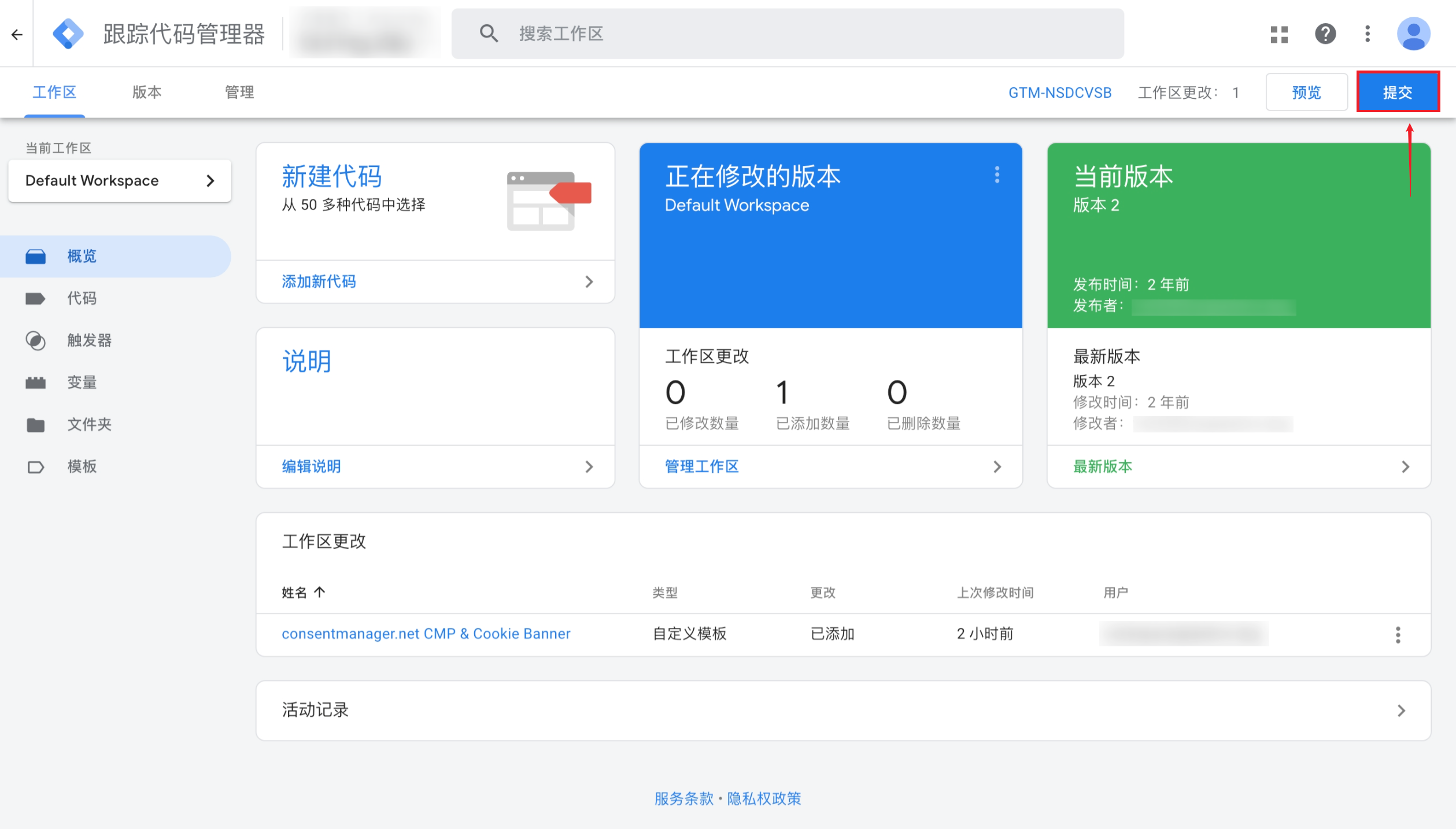 (11)保存完毕后即可提交本次工作更改,完成ConsentManager CMP通过Google TagManager方式部署的过程。