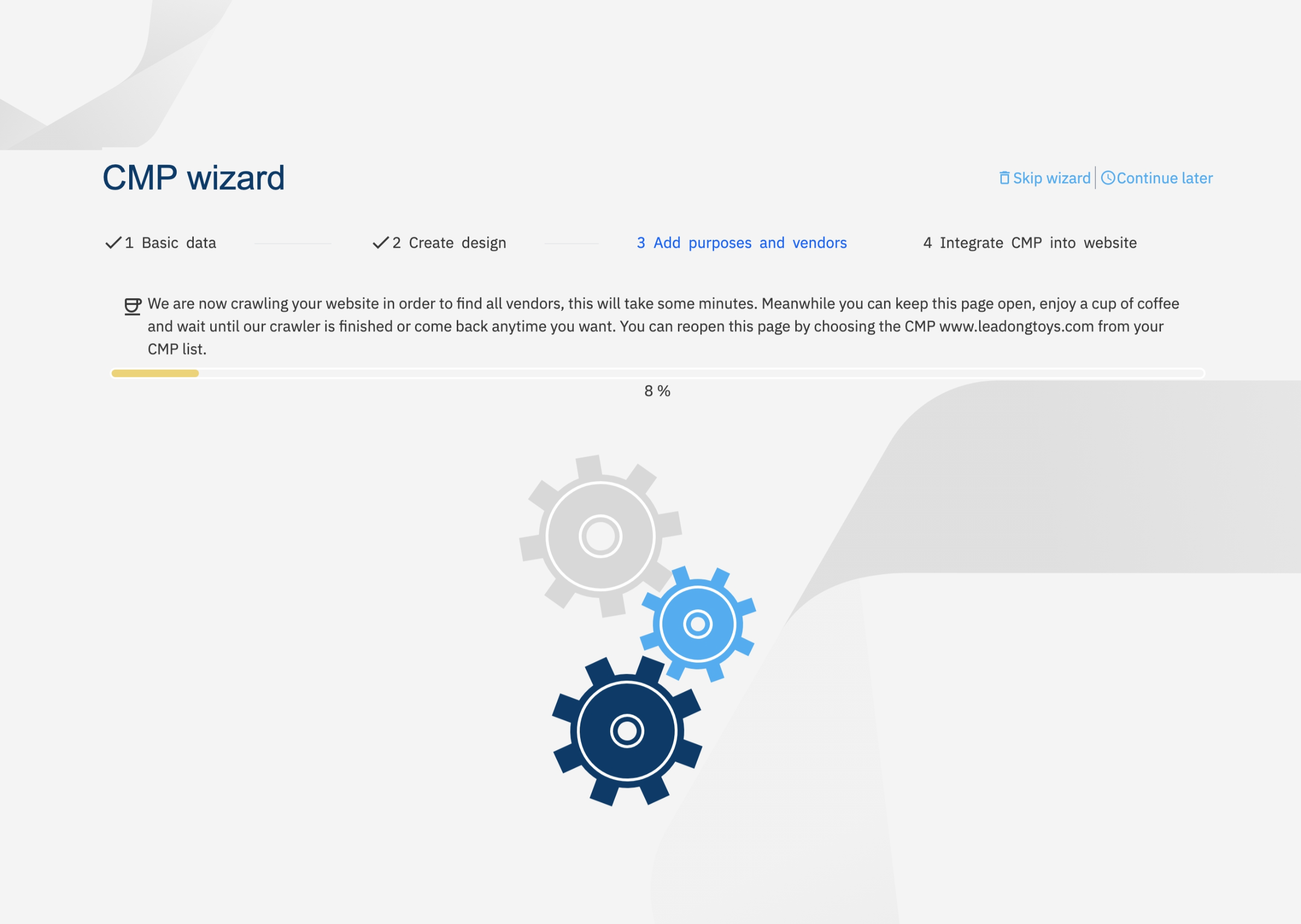 (4)第三步为配置网站Cookie的分类及供应商,在此步骤中ConsentManger将使用爬虫收集网站各页面中可能的Cookie供应商,爬取过程约耗时1到5分钟;