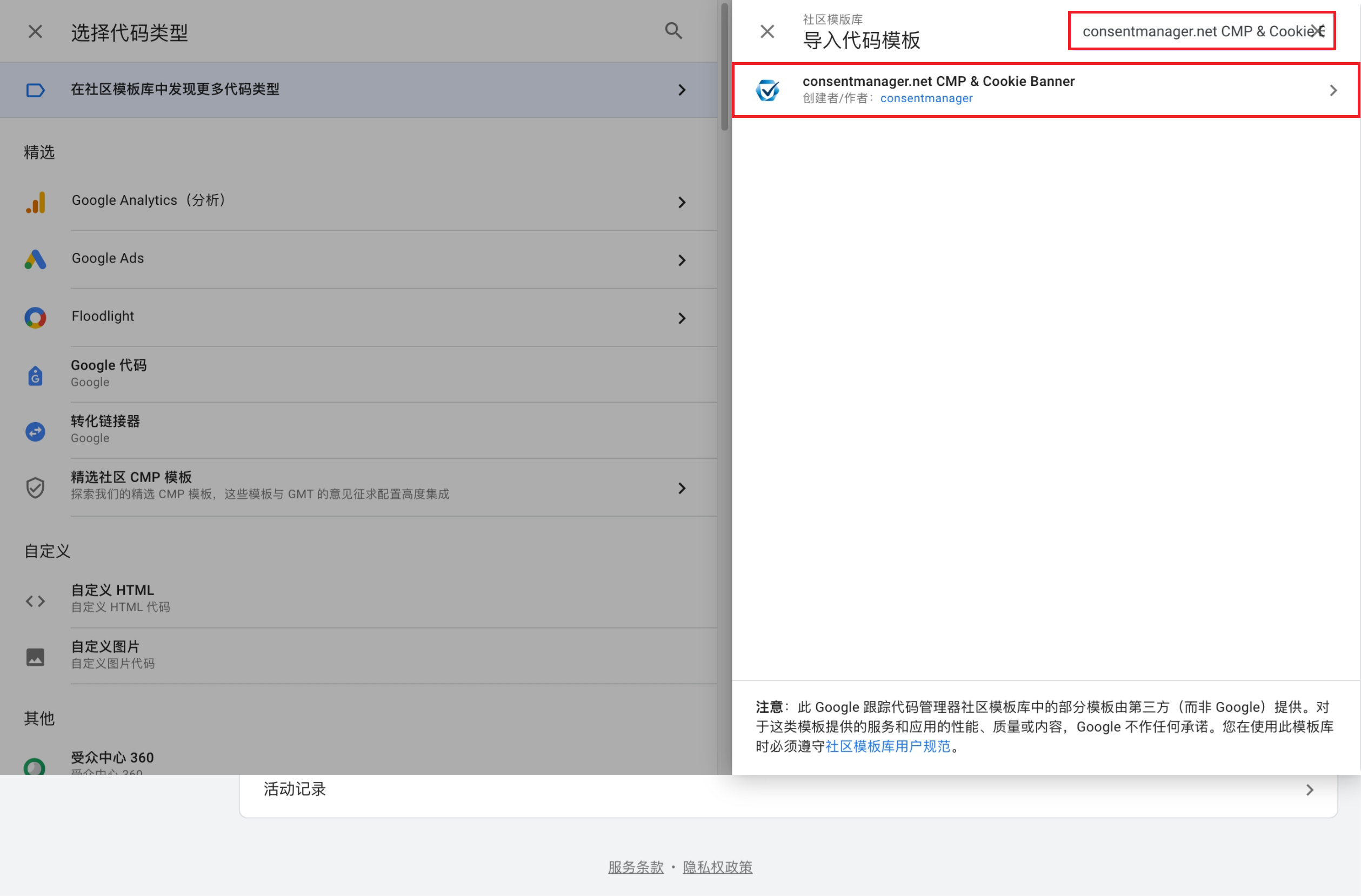 (4)在“导入代码模版”侧边栏中,搜索“consentmanager.net CMP & Cookie Banner”,并点击搜索结果;